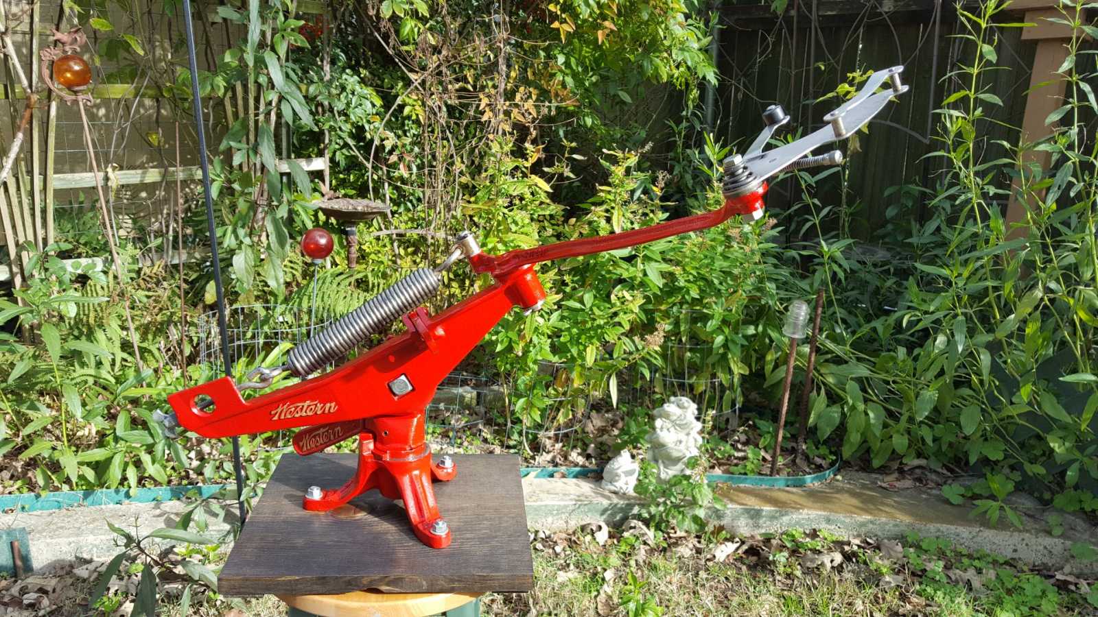 Restored a vintage clay pigeon launcher for a neighbor. Here's the results. Does the color look familiar, (sunrise red)